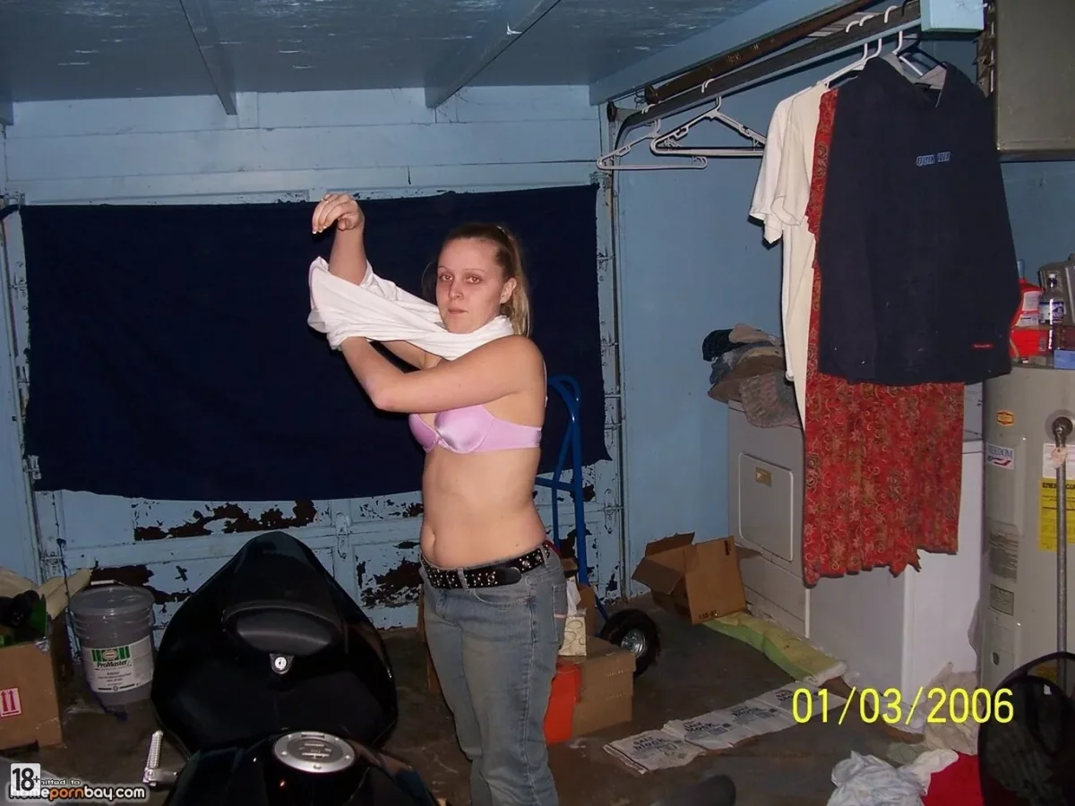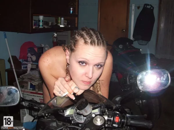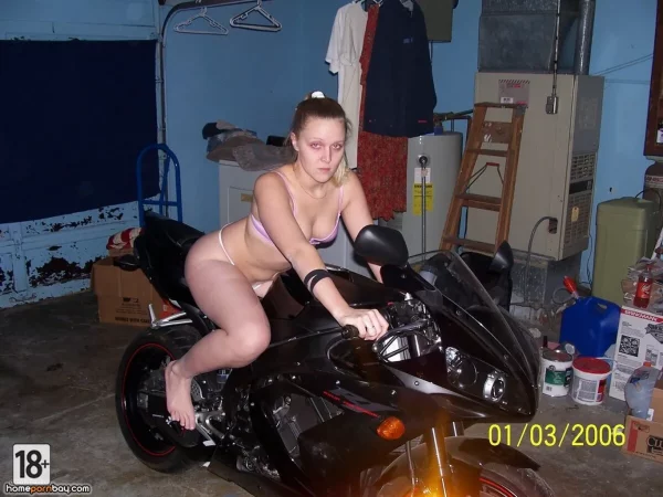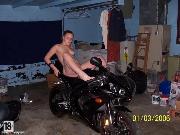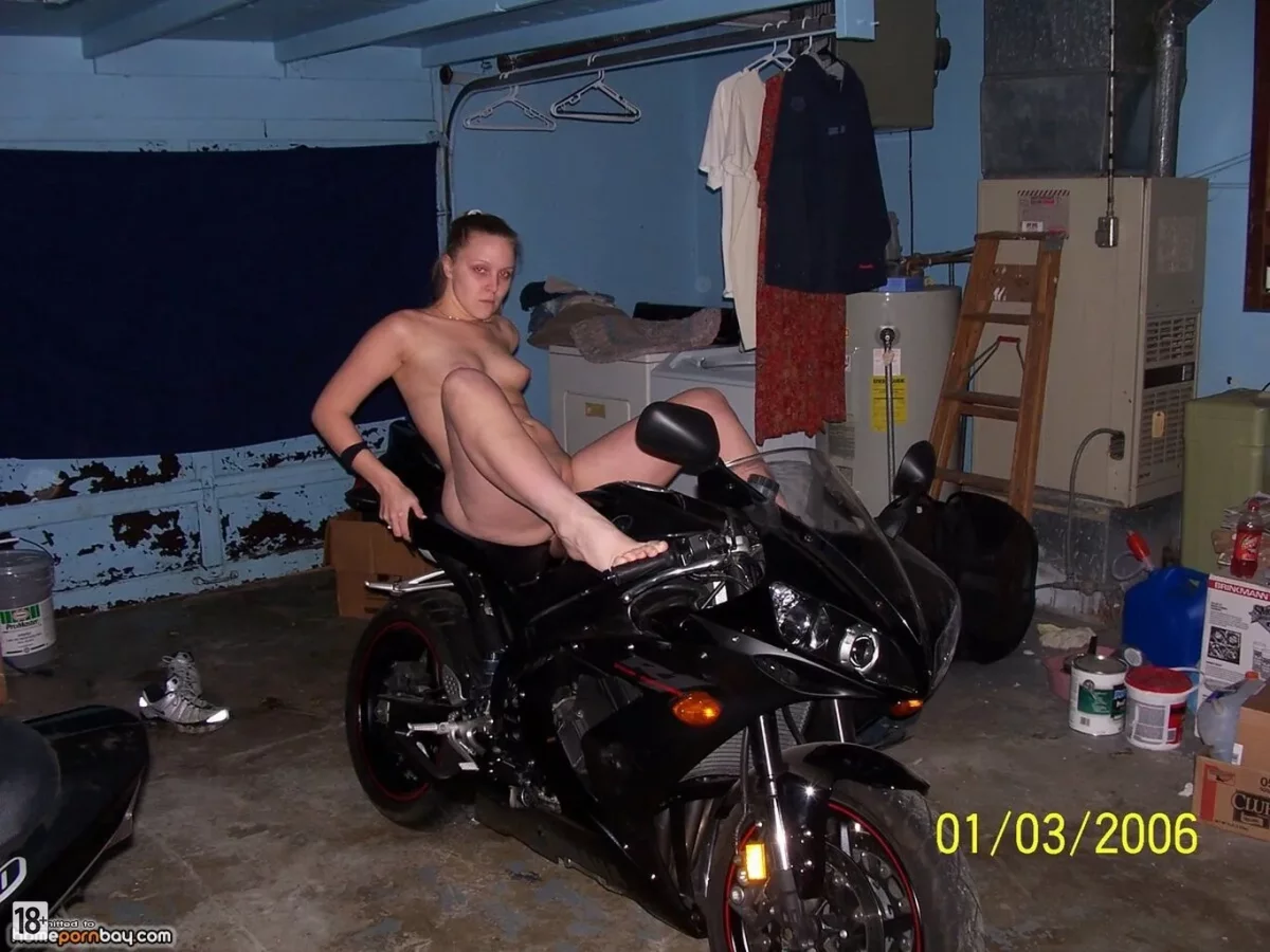 Голые фотки — жаркая дамочка в гараже разделась догола, позирует с мотоциклом, выставляет напоказ гладкую пилотку и роскошную жопу, будто из порно для истинных ценителей разврата.